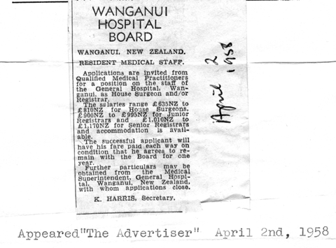 Fortunately, I had the foresight to carefully preserve the advertisement as, when I applied to the Wanganui Hospital Administrator for my return fare on completion of my twelve months, he initially denied that such an offer had been made and it was only when I produced the advertisement that he paid my dues.