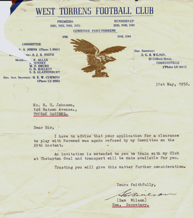 I had trained well and played well on the wing in their trial matches. Jack Oatey, their famous coach at the time, confided to me just before the opening of the season that the selection committee was planning to select me on one wing with Dougy Olds, a Norwood and State player on the other, together with Peter Koerner at centre. I was excited and continued to train with gusto. However, one week or so before the first match, Norwood’s application for a clearance for me from the West Torrens Football Club was refused. Our family had shifted from Woodville to Toorak Gardens the previous year which put me into the Torrens zone. I appeared on West Torrens’ radar only after the request from Norwood and I found this irritating. After they’d done their research and dashed my expectations, they invited me to train with them. I attended one of their sessions in the company of Magarey medallist Lindsay Head, the famous Hank brothers, Mick Clingly and others. My understanding was that if I attended a training session, I would be given a clearance.