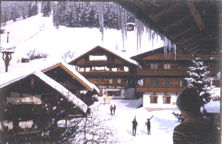 The train went straight through to a town near Alpbach and we were transported to the village. What a picture postcard place it was and what fun we had with ski lessons from Hansel twice a day, after which we adjourned for après-ski – akin to the 19th hole in golf – music, thigh slapping dancing, glűhwein and Austrian apfelstrȕdel. The glűhwein was made from heated red wine to which was added cinnamon and cloves. If one felt particularly cold, then schnapps was the order of the day. Schnapps is a spirit made from various fruits – apples, pears, plums or cherries – akin to Russian vodka and similarly tossed down in one motion. One glass usually warms the cockles! Two gets one on the dance floor and three causes somnolence! Certainly, on one occasion when Sadie was suffering from a sore throat and was off-colour, a couple of schnapps put her right back into the swing of things and back up the slopes!