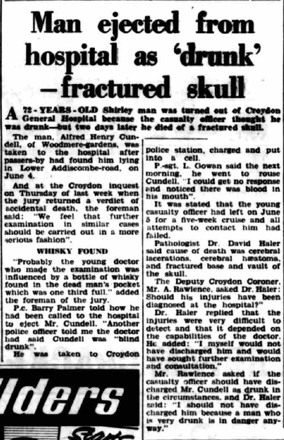 The hospital engineer who lived in the flat above us told us there had been a great hue and cry at the hospital about the coroner’s court findings which were very critical of the Croydon General Hospital Casualty Department. The Coroner was unimpressed with the responsible doctor absenting himself on holidays, and the responsible Consultant Orthopaedic Surgeon inconveniently committing suicide. The Daily Telegraph featured the coroner’s criticism and championed the public’s shock/horror for a few days and then – like all newspapers – today’s news becomes tomorrow’s fish and chip wrapping!