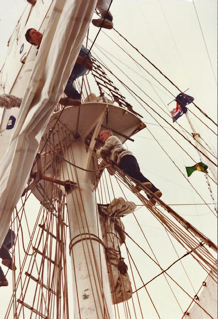 We were shown our quarters on board – small cabins in the fo’c’sle of the ship with three to a cabin, cramped but comfortable. We were taken on a tour around the ship – the wheelhouse, the mess room, the rig and sails – and given instructions regarding our duties, which included the cleaning of the toilets. The regular crew were all Swedes but without exception spoke perfect English. I was apprehensive about climbing the rigging to set the sails as ascending heights was not my favourite thing. We were told that setting the sails was optional and was done under the direction of the regular crew. There was no such hesitation on the part of Celia, who embraced climbing the rigging with zest. She had no hesitation in setting the top gallant sail over 100 feet above deck level, even with the boat pitching and rolling – movements much accentuated at the top of the mast. I feared for her safety, especially as I noted how warmly she was received and encouraged by her Swedish fellow sailors aloft as they went about their duties, bronzed and shirtless! It was with great trepidation and driven by pride that I forced myself to climb to the first cross tree to help unfurl the foresail. The most frightening manoeuvre I found was having to climb onto the wooden platform between the spars. This necessitated having to unhook one’s safety harness, climb over the edge of the platform unharnessed and rehook again after one was on the platform. I was relieved when it was my turn to clean the heads (toilets).