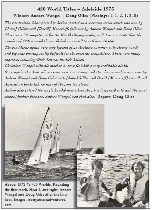 Returning to our final championship race, the day turned out be sunny and calm, with a gentle 7-8 knot zephyr from the southwest. We all assembled to jostle at the start line where I managed a good start over the line. The breeze dropped even further, although we were never becalmed. Those conditions suited me admirably and I was able to maintain my position around the whole Olympic course. Approaching the finish line, I thought I could be in with a chance but Don Woolman was too far ahead. He crossed the line well ahead but, strangely, did not receive the gun. He had been disqualified as he’d broken the start line. Imagine my surprise to hear the gun as I crossed the finish line. It was the only 420 race I had ever won but it was a good one, being an Australian Championship. Upon returning to shore, I was duly overpowered by Anders Wangel and Don Woolman and given a traditional dumping in the sea. The most satisfying feeling was that I had beaten the World 420 Single-handed Champion, Anders Wangel.