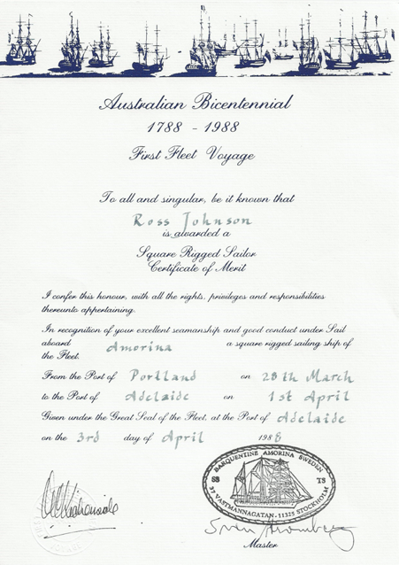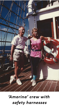 In 1988, the opportunity arose to join the First Fleet Re-enactment to celebrate Australia’s bicentenary. The invitation was for crew to sign on at Portland in Victoria and sail a square-rigger to Port Adelaide, calling at Kangaroo Island en route. Bill and Chris Hobbs and our youngest daughter, Celia, and I decided it would be a great experience and so we signed on and travelled to Portland to join the Amorina, a square-rigger. The fleet comprised some six or seven square-riggers which had sailed from England to Australia via Rio de Janeiro using the trade winds, as had the First Fleet. Square-riggers are only able to sail with the wind, not against it, as can modern sailing vessels.