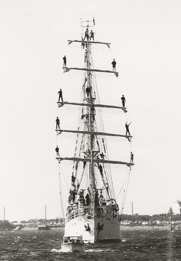 The next morning we found ourselves approaching Port Adelaide with a huge armada of spectator vessels coming to meet us. As is customary on these ships, the crew positioned themselves on the ends of each spar. I was horrified to see Celia standing on the top spar with no safety harness. Somehow she survived but my nerves were shattered and I was very relieved to disembark.For my part it had been a worrying trip, not the crewing and sailing which was most enjoyable but it was a harrowing experience as the sole parent on board to get my daughter home safely. She took a fancy to one of the young Swedish crew who reciprocated and I found myself trying to chaperone her as well as crewing full time. On one occasion, I lost her altogether and searched the ship high and low. I became desperate and approached the captain and first mate and told them my daughter was missing – perhaps overboard. They took no notice of my concern and did nothing. I spent half a day trying to find her, even searching the crew’s quarters. Eventually, to my relief, she turned up.