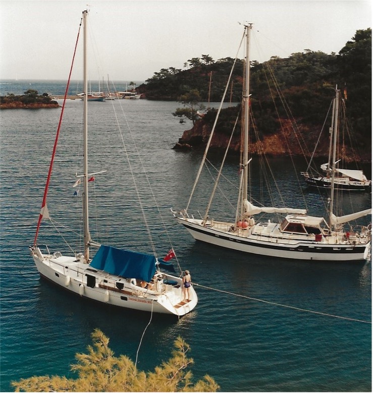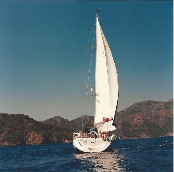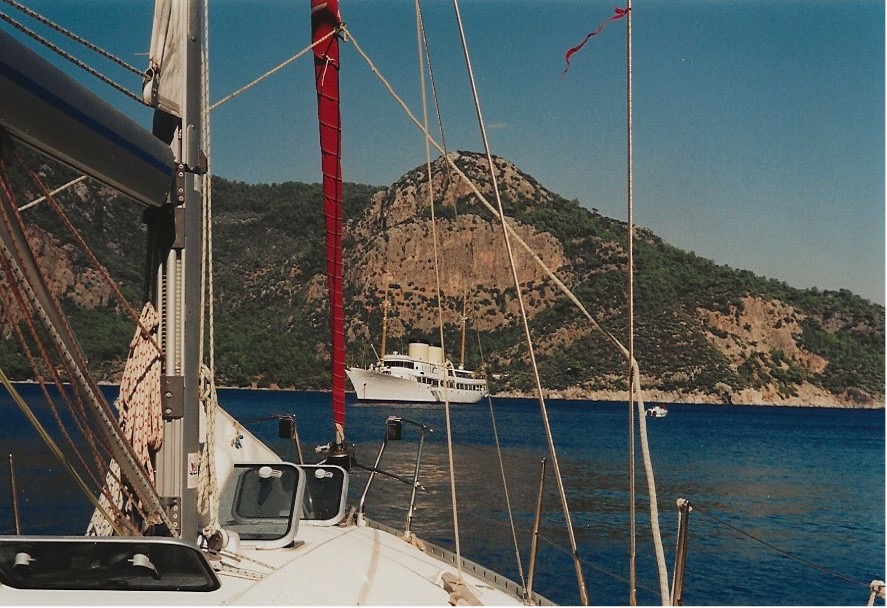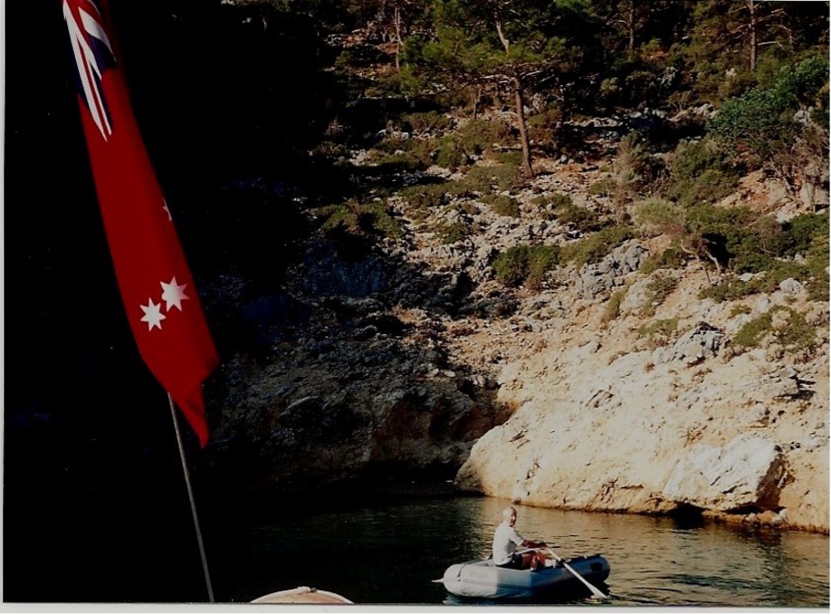 In 1996, we were invited to a 60th birthday celebration where we sat next to long-time friends Ian and Margaret Leonard. As the celebrations proceeded and the champagne flowed, Ian came up with the brainwave that we should hire a bare boat in Turkey and sail around the Turkish coast. Sadie and I agreed and Ian there and then rang Bill Hobbs and his wife Margaret and invited him to join the expedition, making six of us in all. Ian took it on himself to do the arranging and he organised for us to hire a beautiful 45-foot Beneteau Oceanis yacht. In the sobre light of the next day we had a few doubts but we were commited and so the trip took place in the northern summer of 1996*.