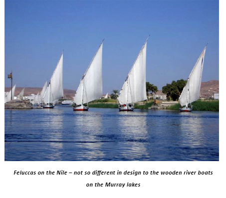 I fantasized briefly on importing a hull to Goolwa and fitting it with a lateen sail which I felt would be very well suited to the Murray River, but then reality was restored and I realised how expensive it would be and how different the climate was at Goolwa with a minimum of gentle breezes. In fact we had no respectable wind on the Nile whilst we were there and more often than not our crew were forced to man the enormous oars and row us to our destination.