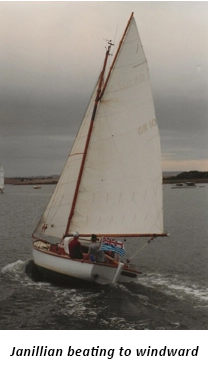 Janillian was by and large well- balanced, with not much pull on the helm to windward – but with the wind astern, the helm became very heavy, requiring two people to keep her on course, especially when the wind freshened. We snapped at least one tiller in a Milang-Goolwa. Fortunately, we always carried a couple of spares in the locker.