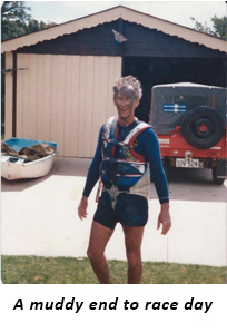 It may have been in that same race that we again capsized, this time cartwheeling so that both hulls nosedived into the water throwing us into the air and spearing the top of the mast into the mud. It happened not far from the finish line opposite Veenstra’s Marina. That is a situation that requires outside help and a kind spectator launch threw us a rope and pulled the top of the mast out of the mud. We went ashore on Hindmarsh Island, sorted out our sheets and sails and eventually crossed the finish line opposite the Club House but well behind the leaders.