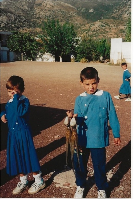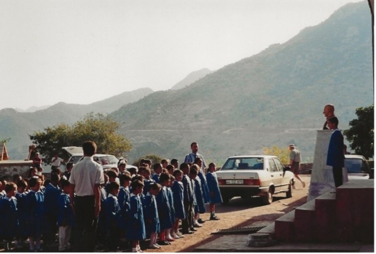 We returned for a very nice breakfast at Dusan’s restaurant the following morning – orange juice, omelettes, bread, jams and coffee – and then piled into his station wagon, together with his son (nicknamed Rambo because he had been born during Ramadan). Five of us had seats and the other three lay in the back, seat belts not supplied. Our first stop was at the local primary school, built next to the water, where the children were just gathering.
